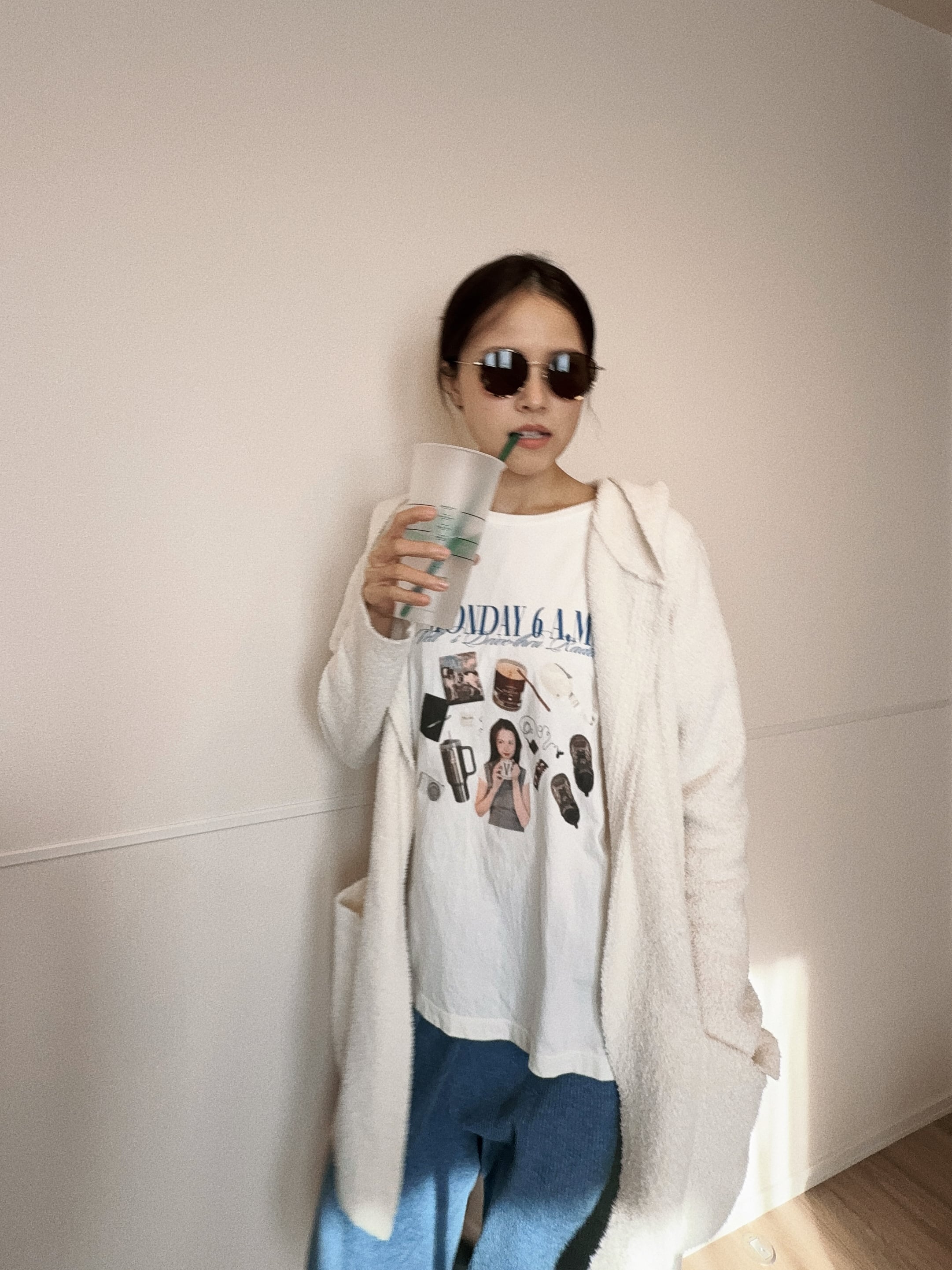 ポッドキャストによく登場する私のおなじみの日用品をふわふわ浮かべたよ。私の写真もドドンと入れてみちゃいました。色は “バニラホワイト”!ちょっとビンテージ感の出る色合いでかわいい!部屋着でも普段着でも着れるおしゃれさを目指してデザインしました!
